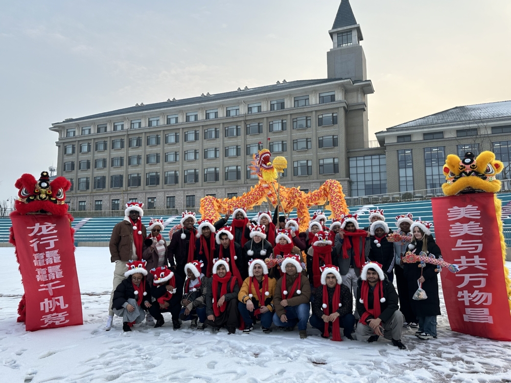 During the event, our international faculty and students, under the hands-on guidance of cooking instructors, participated in preparing traditional Jiaodong New Year's Eve dinner. They also engaged in traditional Chinese New Year customs with cultural and creative teachers, such as paper cutting, writing Spring Festival couplets, crafting the character Fu, steaming festive flower buns, and watching dragon and lion dances. They experienced the rich atmosphere of Chinese New Year and immersed themselves in traditional Chinese festival culture.