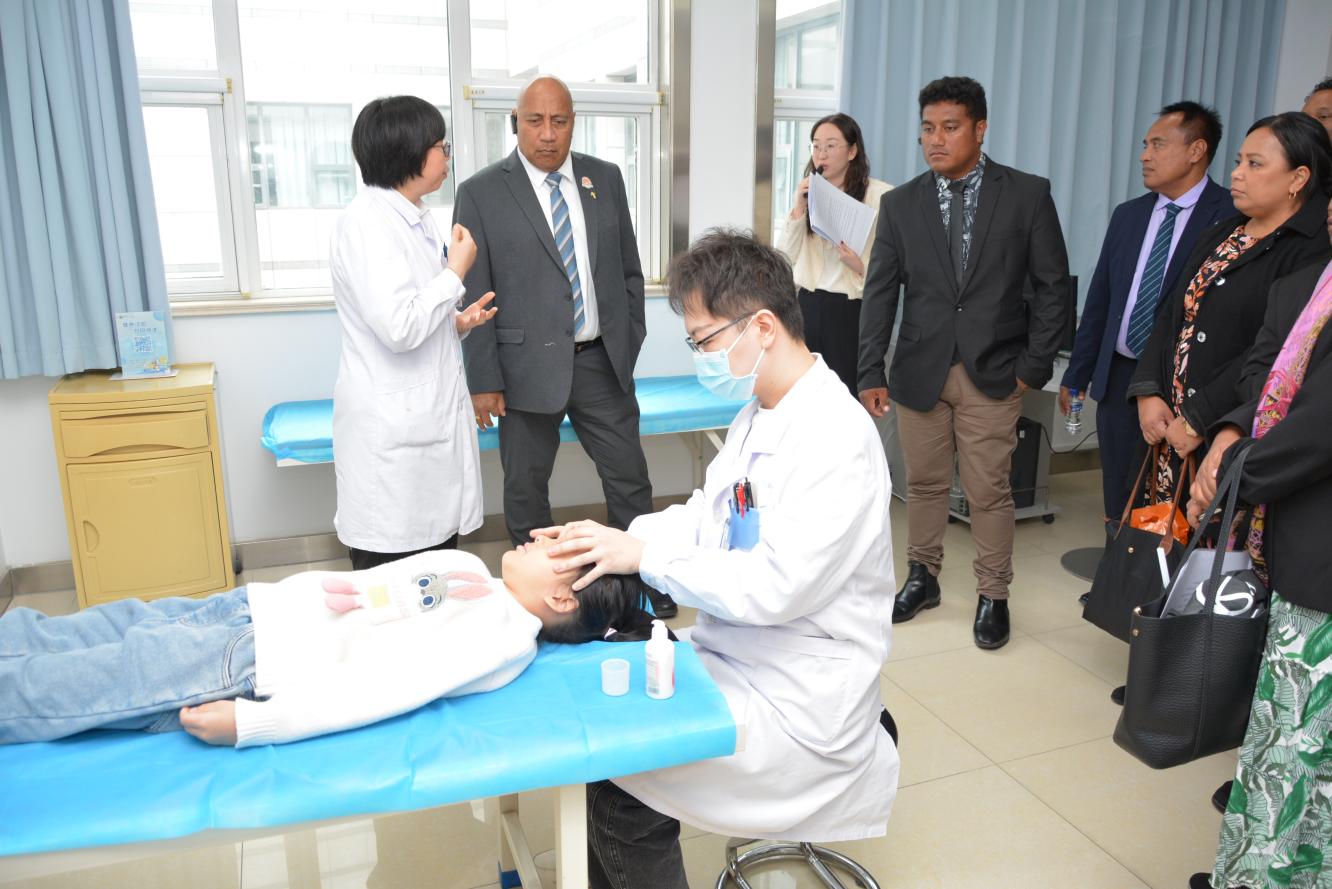 During the visit, Minister Nauan and his delegation toured the BMU History Museum and the Special Education and Rehabilitation Exhibition Hall. They spoke highly of BMU's dedication to education, its social responsibility, and its remarkable achievements in the field of higher education for students with disabilities. The delegation also made a special visit to BMU's Yantai Affiliated Hospital to meet with members of the Chinese medical teams recently returned from Kiribati, expressing sincere thanks for their contributions to the health of Kiribati people. During the hospital visit, the delegation toured specialized departments, gaining detailed insights into the hospital's strengths in areas such as traditional Chinese medicine (TCM) diagnosis and treatment, endoscopic techniques, and clinical skills training.