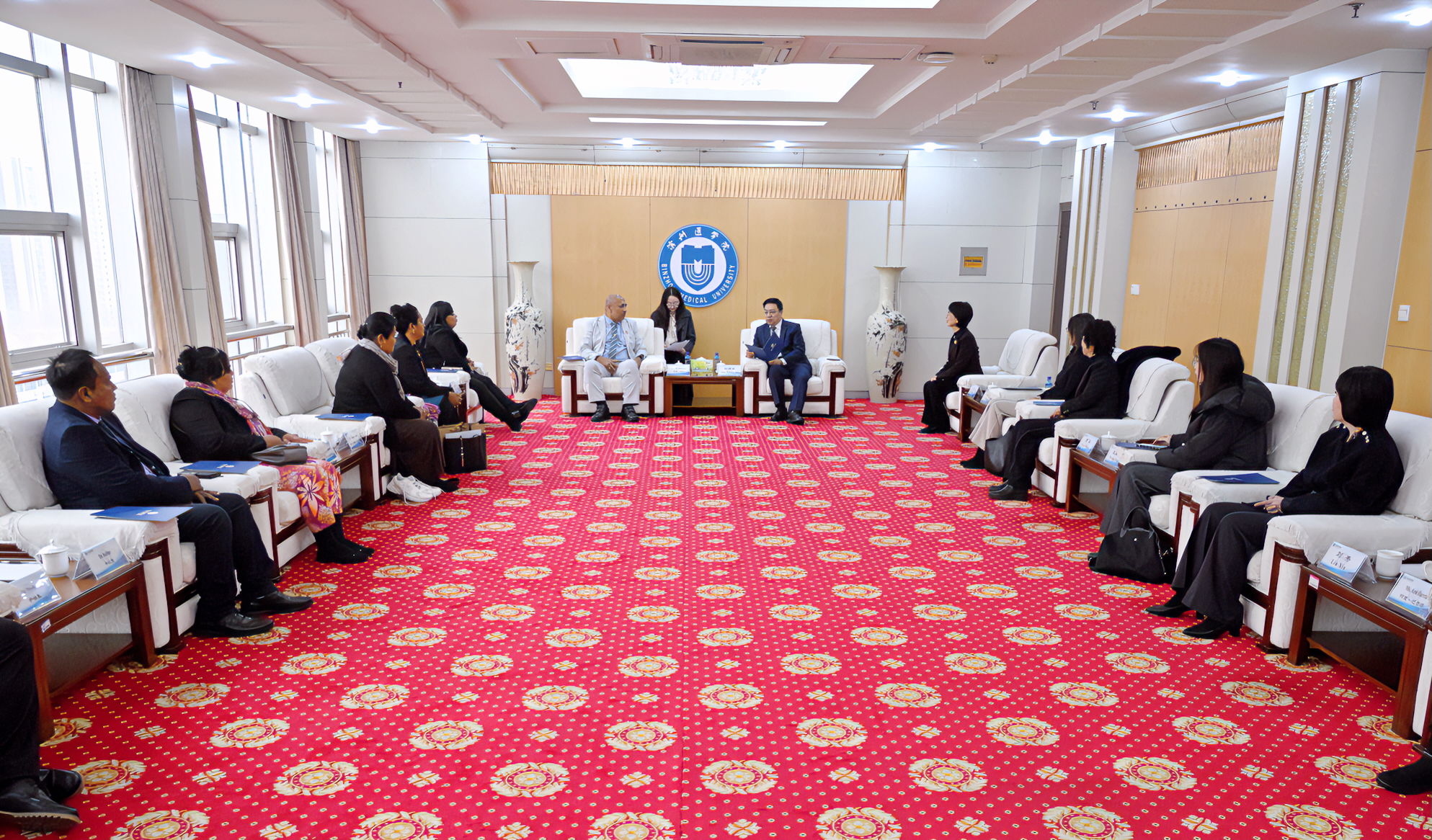 Recently, an 11-person delegation led by Honorable Bootii Nauan, Minister of Health and Medical Services of Kiribati, visited Binzhou Medical University (BMU). Sun Xiangjun, Secretary of CPC BMU Committee, met with the delegation in the university's office building, with Vice President Yu Li also in attendance.